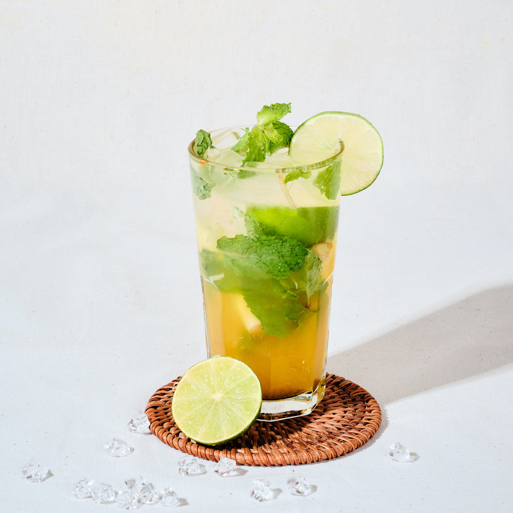 (1) Muddle the brown sugar, mint leaves, and lime wedges together in a tumbler