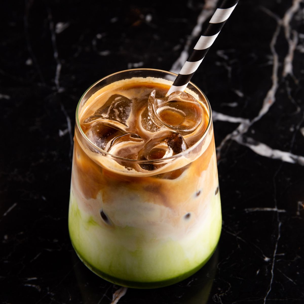 3-layered Calia signature matcha latte with espresso and milk