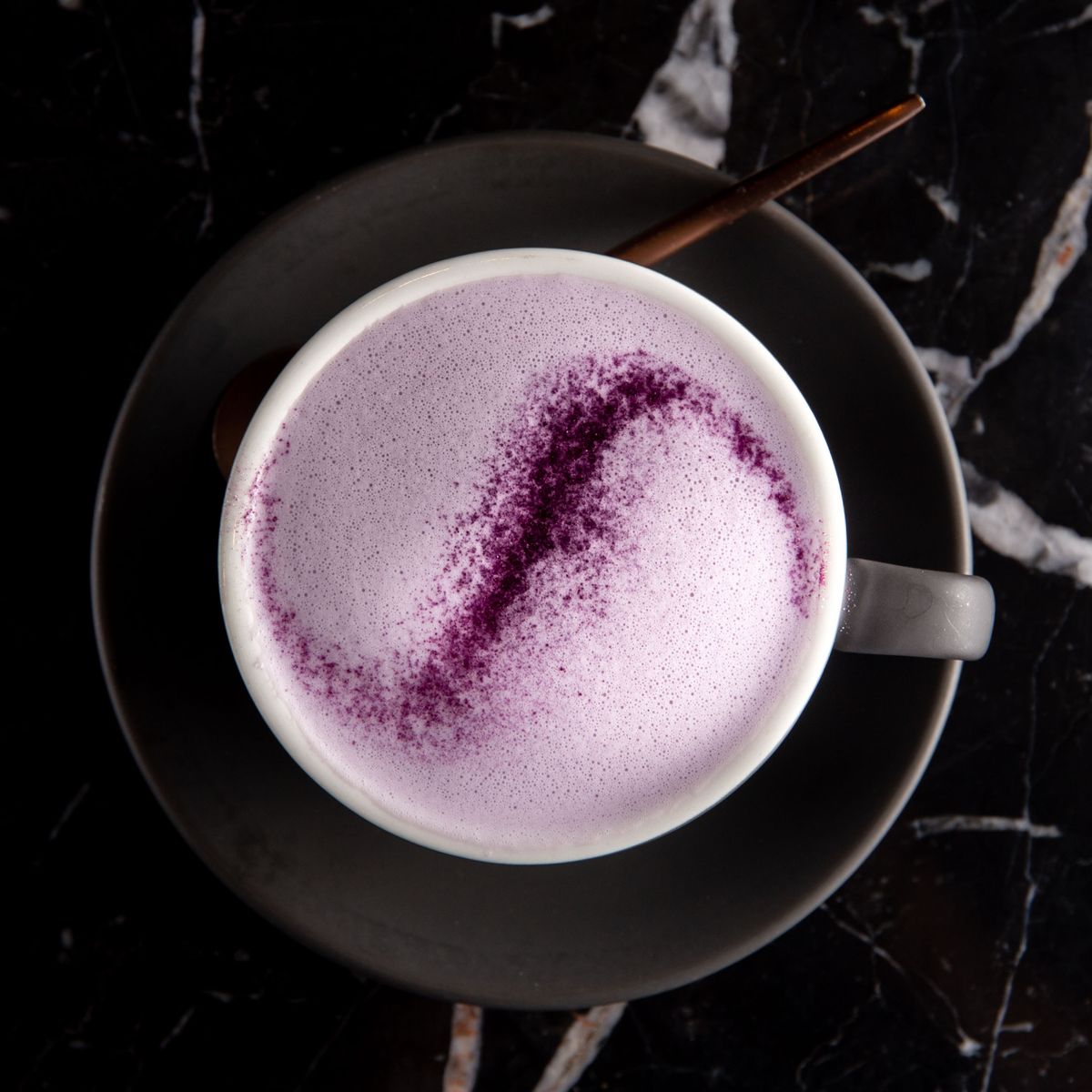 Korean sweet purple potato has been mashed, dehydrated and grounded to create this delicious purple sweet potato latte.