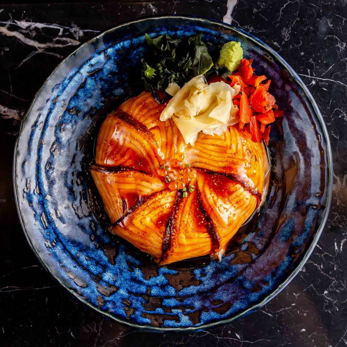 Flamed seared sustainable salmon topped with ikura & our secret Calia sauce on Japanese Akitakomachi rice.