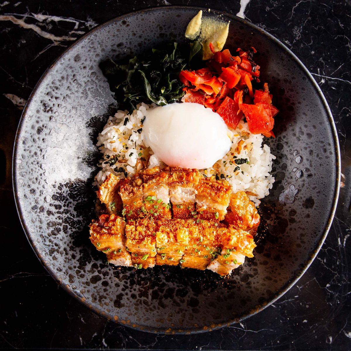 Free range crispy roast pork with ginger sauce and 63° egg with Calia Wasabi Mustard on Japanese Akitakomachi rice. (Not available in Calia Malaysia Stores)