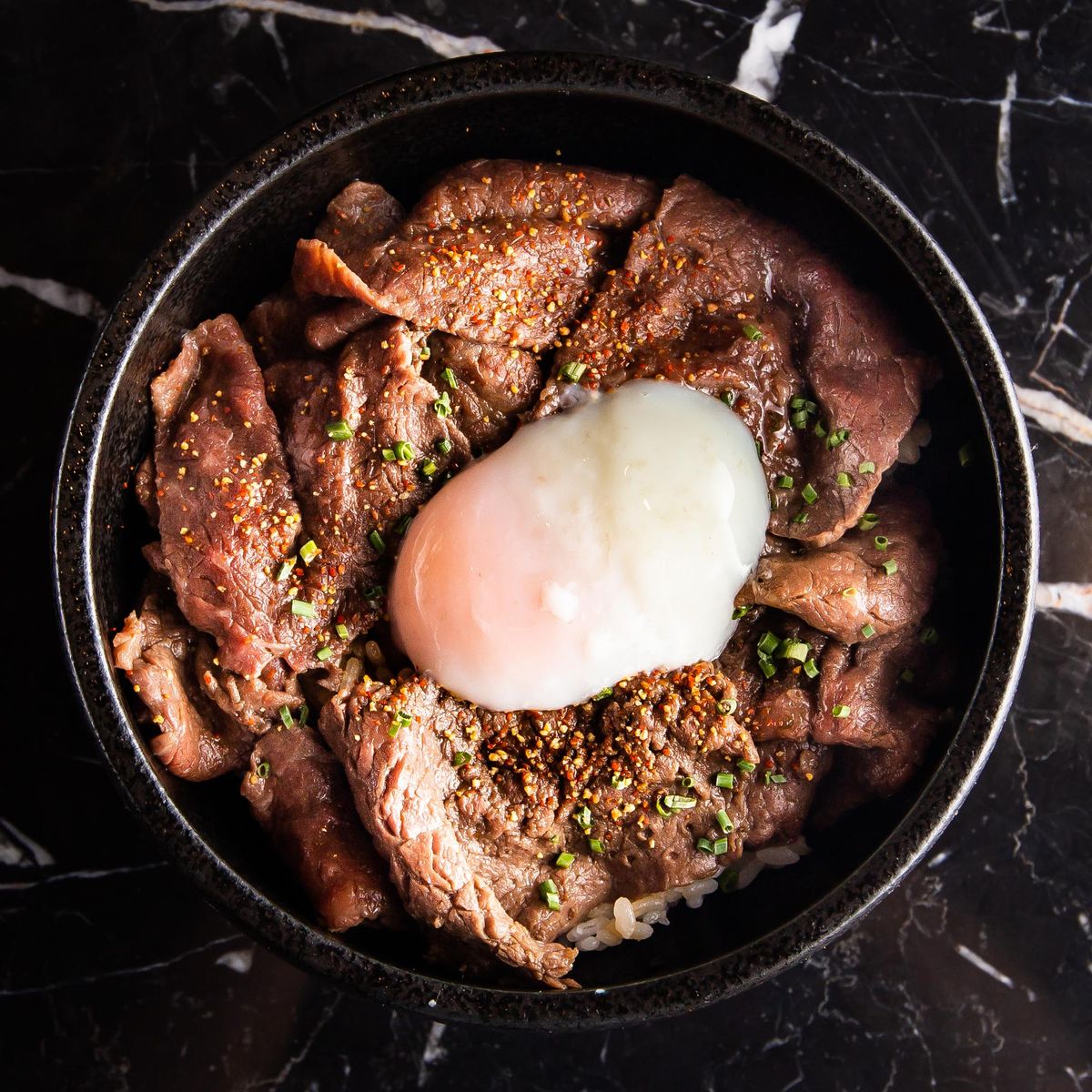 Marbled Australian wagyu slices with mirin sauce and 63° egg on Japanese Akitakomachi rice.