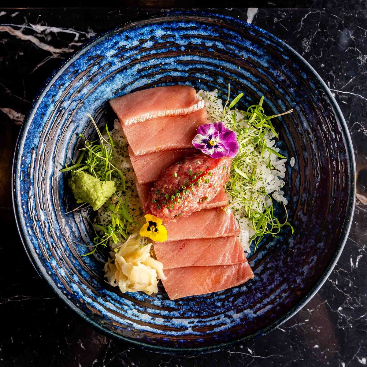 Air flown Japanese toro (tuna belly) from Toyosu Fish Market in Tokyo, glazed with nikiri sauce & toro tartare on Japanese Akitakomachi rice.
