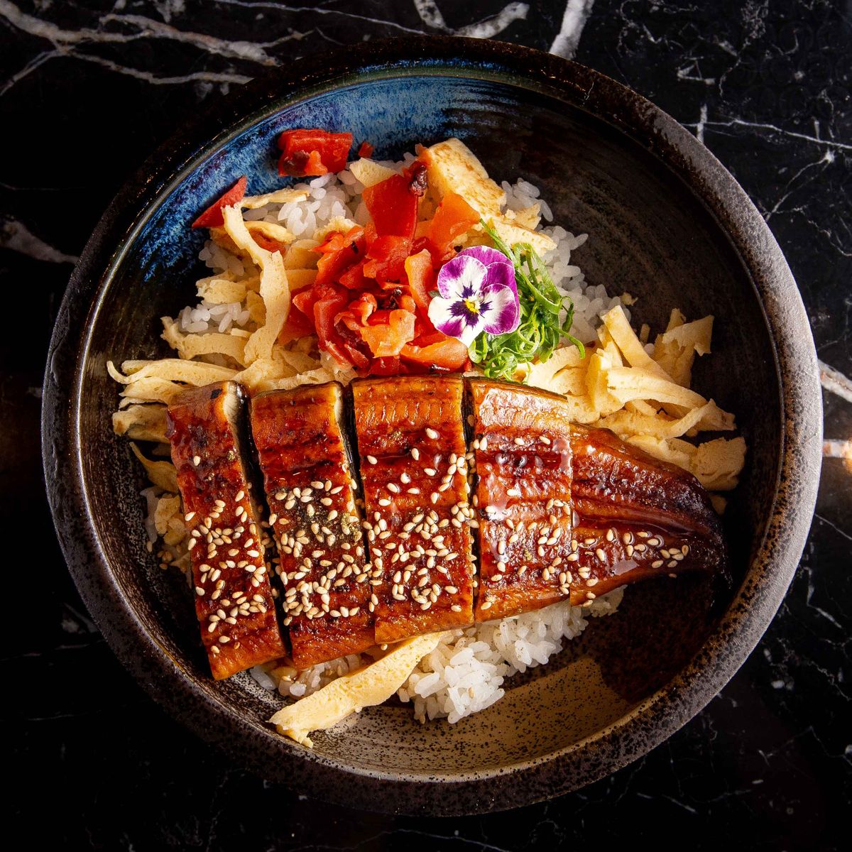Grilled eel with homemade unagi sauce and truffle egg on Japanese Akitakomachi rice.