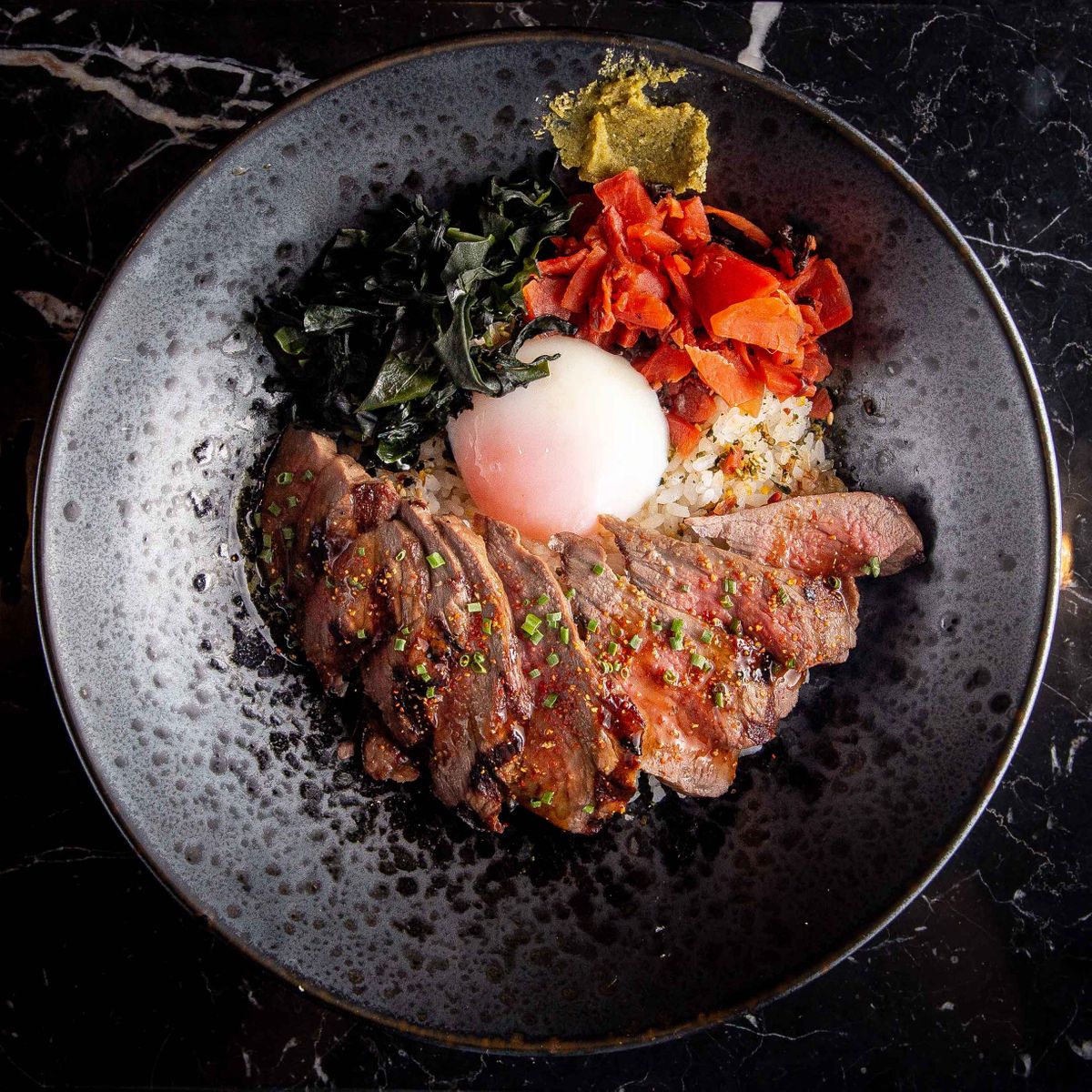 Our Signature Dish - Premium Marbled Australian Wagyu Steak with 63° egg and Yuzu Koshu on Japanese Akitakomachi rice. You can also upgrade your steak to a Japanese A5 Wagyu steak, air flown direct from Japan.